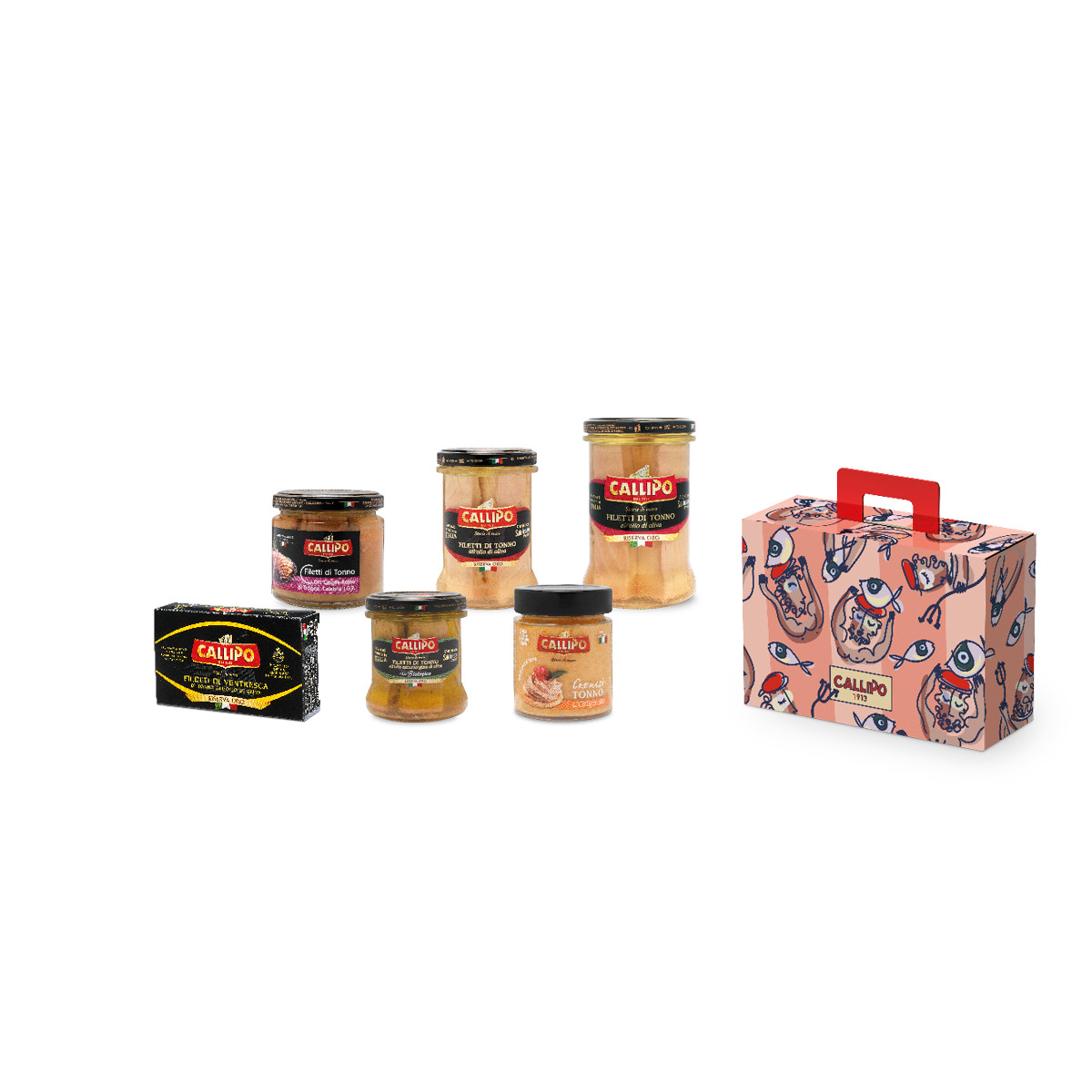 Ispirata alle Barbe Calabresi e corpi mitologici. Il Tonno è tenuto sulla testa in un inno alla vita e al cibo. Cassetta in cartone.